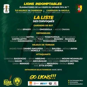 Le sélectionneur des Lions Indomptables, Marc Brys, a dévoilé ce jeudi 2 octobre 2025 la liste des 26 joueurs convoqués pour les deux dernières journées des éliminatoires de la Coupe du Monde 2026, lors d’une conférence de presse tenue dans les locaux de la FECAFOOT.