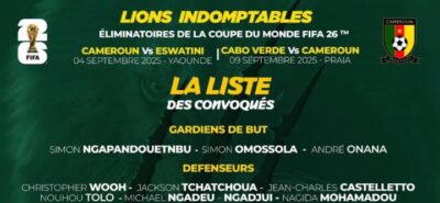 Eliminatoires CDM 2026: Marc Brys rend public la liste des joueurs convoqués Le sélectionneur des Lions Indomptables, Marc Brys, a dévoilé ce jeudi 2 octobre 2025 la liste…